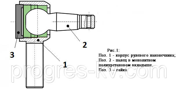 Пропонований виріб являє собою кульовий палець в монолітному поліуретановому вкладиші. Дана конструкція дозволяє використовувати звичайний корпус рульового наконечника, що дуже зручно при проведенні ремонту. Металевий Палець кульовий виготовлений методом холодного видавлювання з наступним загартуванням ТВЧ робочої поверхні кулі. При виробництві поліуретанового вкладиша використаний зносостійкий 4-х компонентний поліуретан Європейського виробництва.